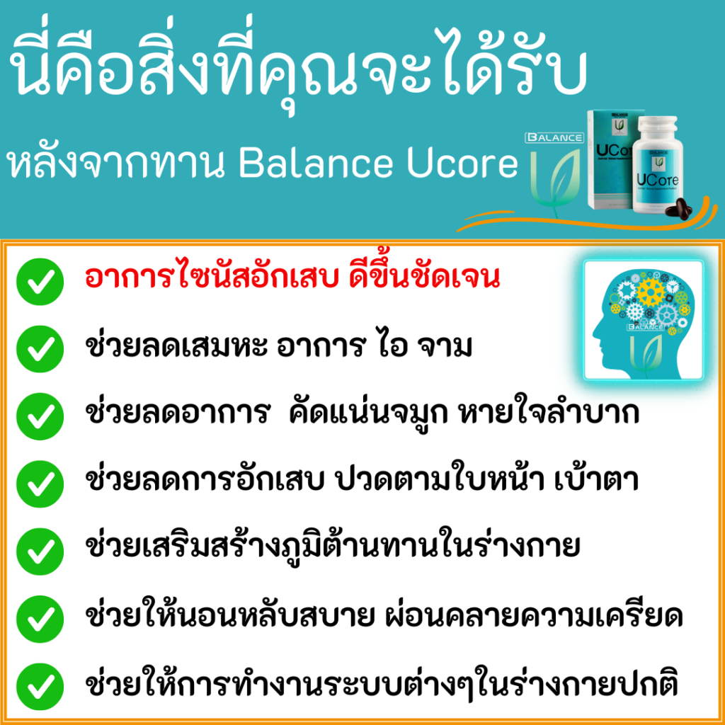 วันหนึ่งจอยไปเดินเล่นที่สวนสุขภาพ ได้เจอเพื่อนเก่า และพูดคุยกัน พอเพื่อนรู้ว่าจอยเป็นไซนัส เขาจึงเล่าให้ฟังว่าก่อนหน้านี้ น้องชายเขาก็เป็นไซนัสอักเสบมา 5 ปีเลย รักษายังไงก็ไม่หาย จนได้มาเจอสมุนไพรตัวหนึ่ง ชื่อว่า Balance UCore กินเพียงไม่กี่วันอาการไซนัสอักเสบก็ดีขึ้นเร็วมาก จนปัจจุบันนี้ อาการก็ไม่กำเริบอีกเลย เขาจึงแนะนำให้จอยลองไปซื้อมากินดูค่ะ
