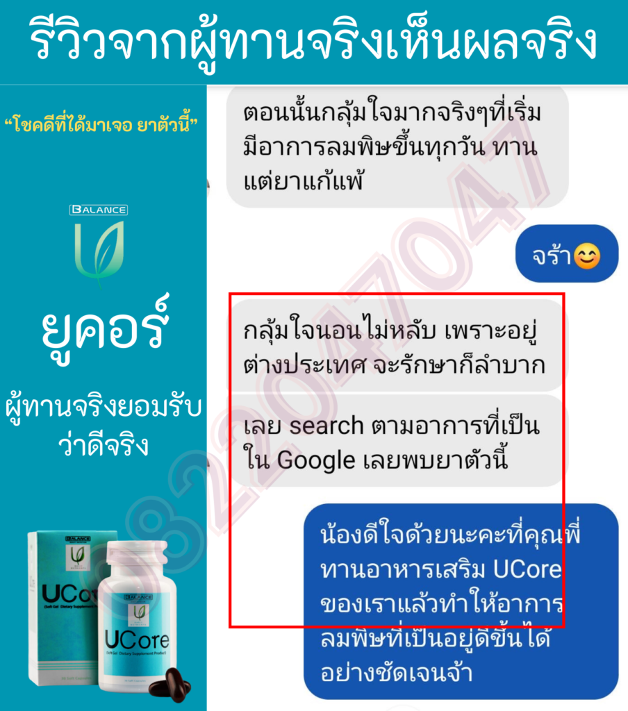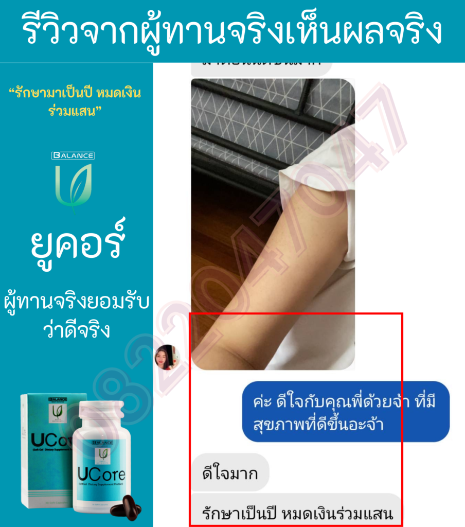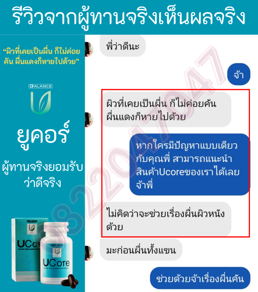 พอเจนได้รับ UCore แล้ว เจนก็กินวันละ 1 เม็ดก่อนนอน กินได้ประมาณ 2-3 วันเเรก อาการผื่นคัน ลมพิษที่กำเริบก็ลดลงไป หลังจากกินไปได้ประมาณ 1 สัปดาห์ อาการ ผื่นคันตามตัว เริ่มดีขึ้น นอนหลับสนิท อาการผื่นคันไม่มารบกวน เจนดีใจมากค่ะ จึงตั้งใจกินอย่างต่อเนื่องจนหมด 3 กระปุก ที่สั่งมา