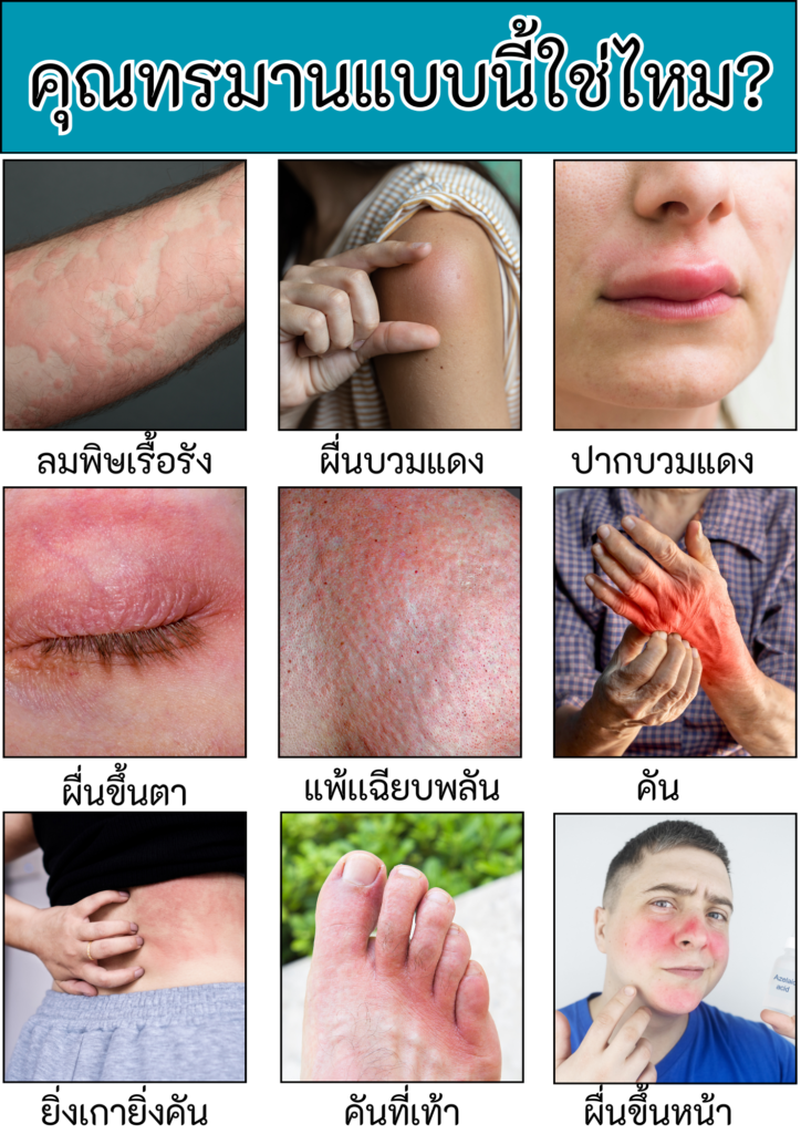 โรคผื่นคันลมพิษ (Urticaria) ลักษะณะจะมีผื่น ปื้นนูนแดงขึ้นตามผิวหนัง หรือนูนแดง ไม่มีขลุย มีหลายขนาดตั้งแต่ 0.5-10 cm. ทำให้มีอาการคัน ผื่นจะเกิดขึ้นเร็วตามลำตัว แขนขา แต่จะอยู่ไม่นานเกิน 24 ชม. แต่เมื่อหายแล้วจะมีผื่นใหม่ขึ้นที่อื่นๆได้ บางรายอาจมีริมฝีปากบวม ปวดท้อง แน่นจมูกหายใจไม่สะดวก หากมีอาการรุนแรงถึงขั้นเสียชีวิตได้เลย..